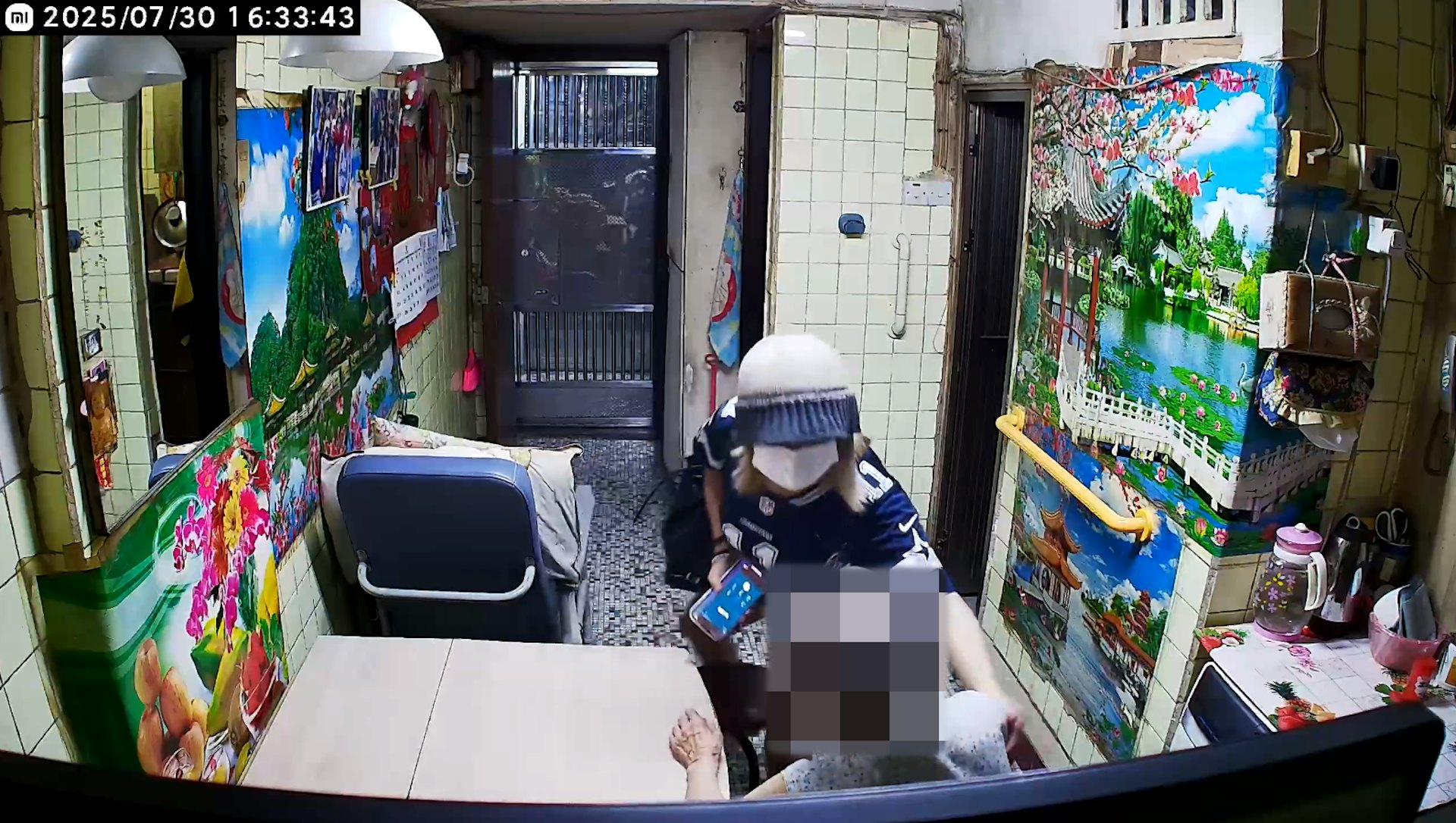其後,事主進房取款期間,身穿藍色上衣的女子留在客廳,並透過電話與冒認「女兒」的同黨對話。電話中可聽見「女兒」詢問:「我阿媽畀咗你未?」藍衫女隨即回應:「佢攞緊。」整段對話顯示二人配合默契,步驟分工清晰。
