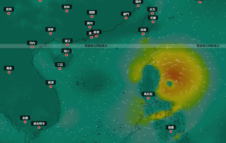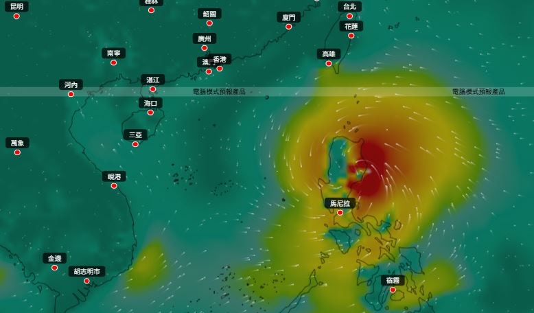 而根據ECMWF,該巨型熱帶氣旋會先靠近台灣,8月25日至8月26日掠過台灣南部進入南海,8月27日最接近香港,隨後在海南島登陸。(ECMWF/Windy.com)