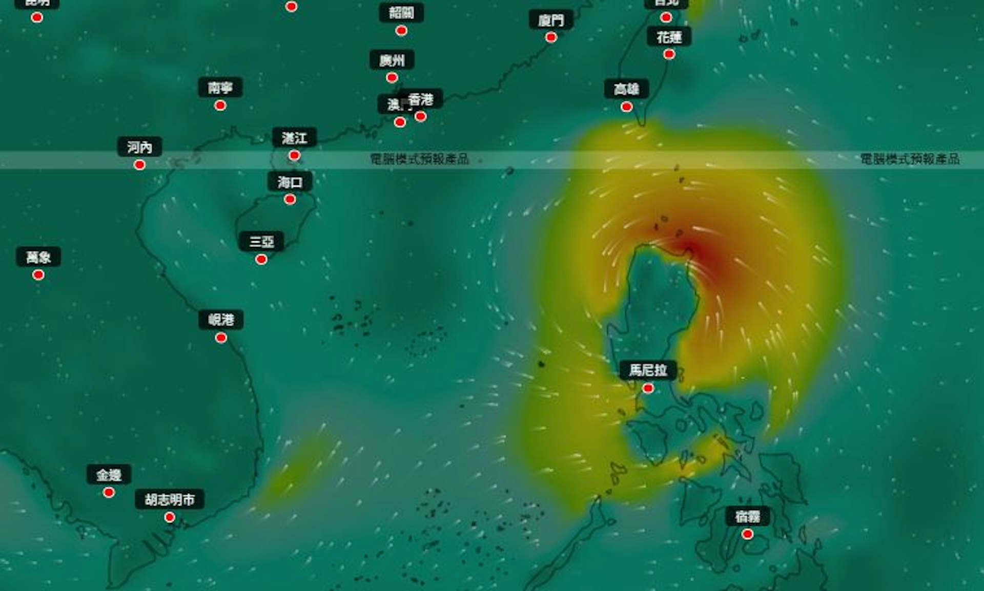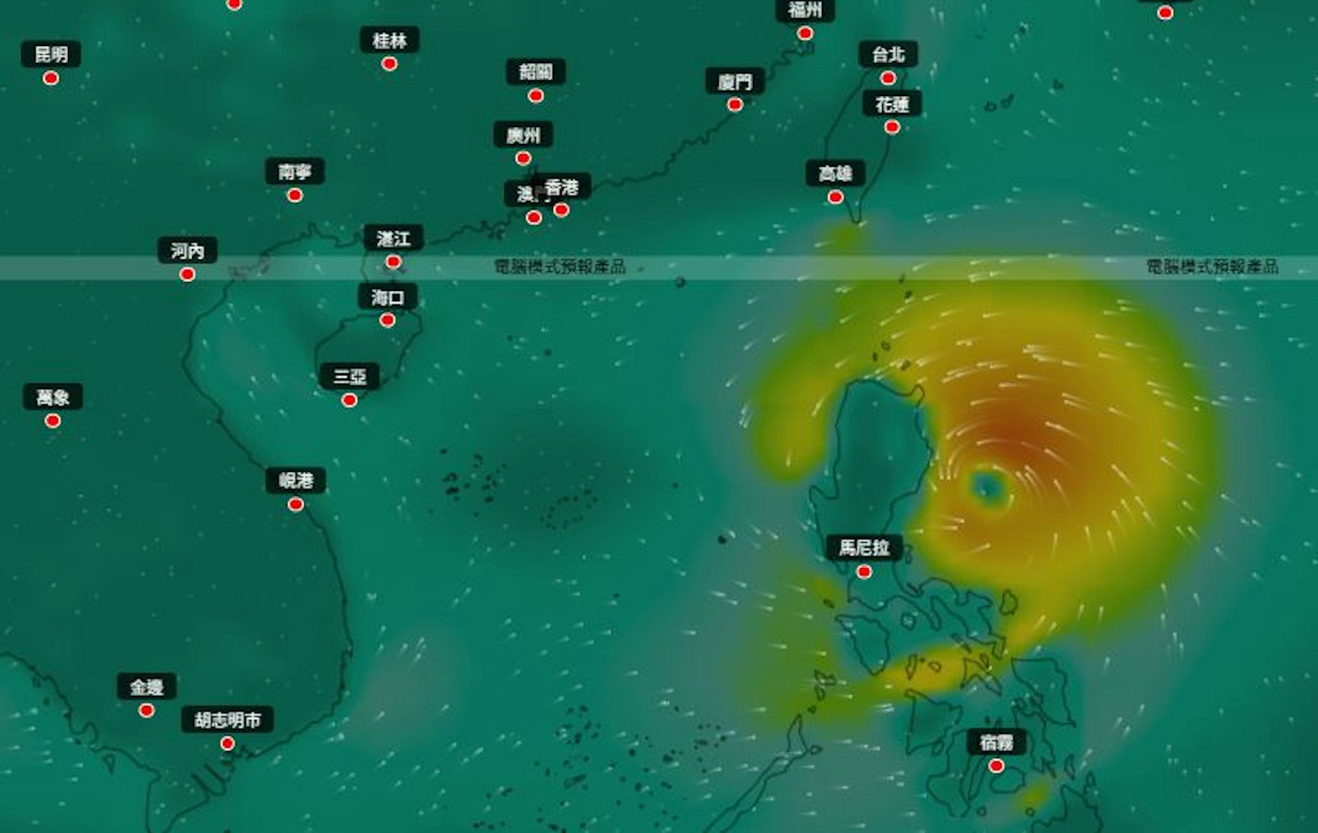 伏羲AI天氣模型也預測,菲律賓東面巨型熱帶氣旋於8月22日至8月23日穿過菲律賓進入南海,並進入本800公里範圍;該巨型熱帶氣旋會在8月24日最接近香港,逼近香港400公里範圍,隨後繼續向西北方向移動,在海南島登陸。(伏羲AI天氣模式)