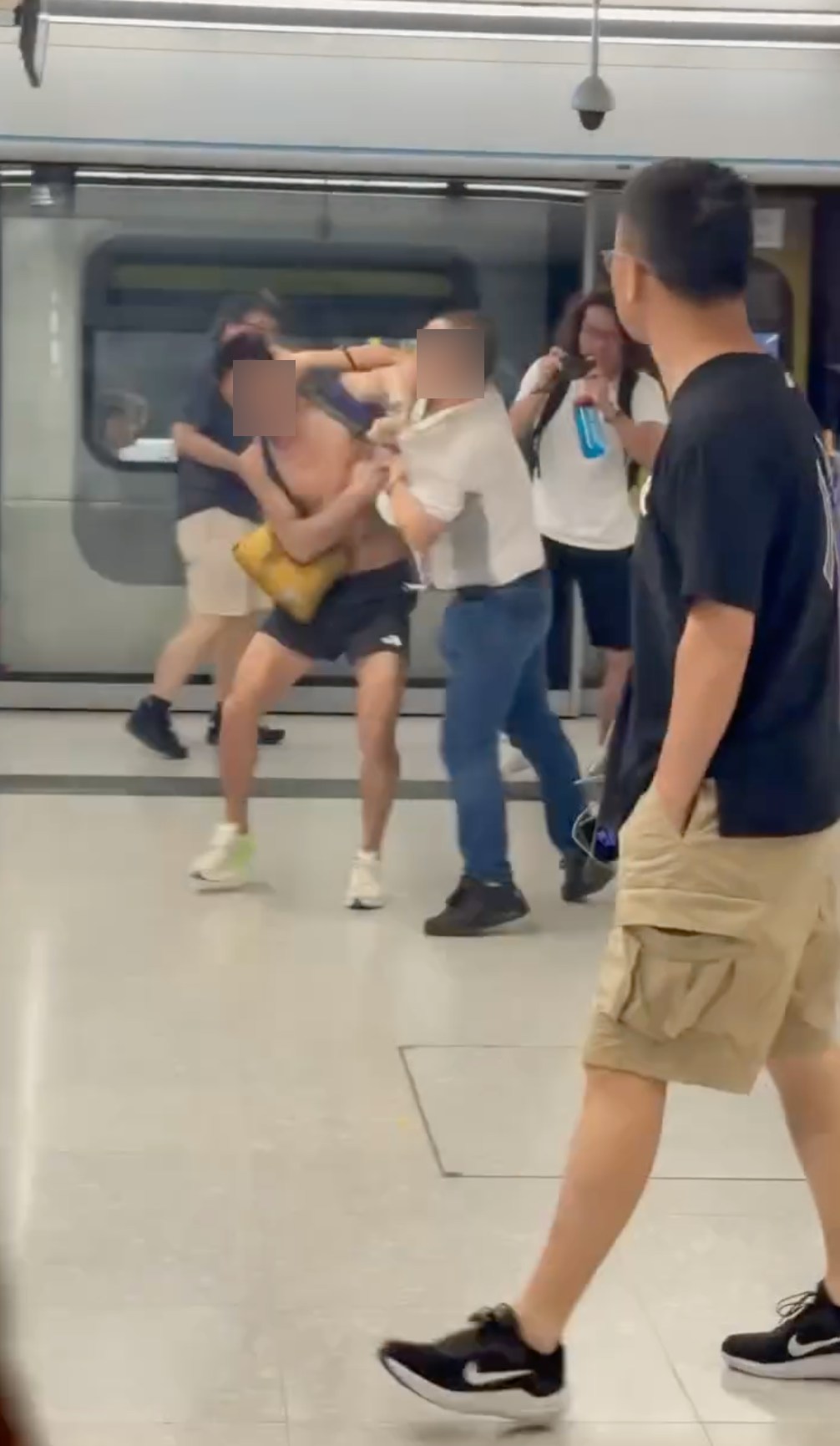 近日網上瘋傳一段短片,畫面顯示在港鐵站月台上,有兩名男子爆發激烈衝突,場面一度混亂。其中一人身穿運動背心與短褲,衣衫凌亂,胸口外露;另一名中年男子則以Polo恤配牛仔褲現身。兩人先是互拉對方衣領,隨後拳腳相向。期間,Polo恤男子多次揮拳擊向對方,更將對手的斜孭袋扯下並丟到一旁;而背心男亦不甘示弱,立即還擊。