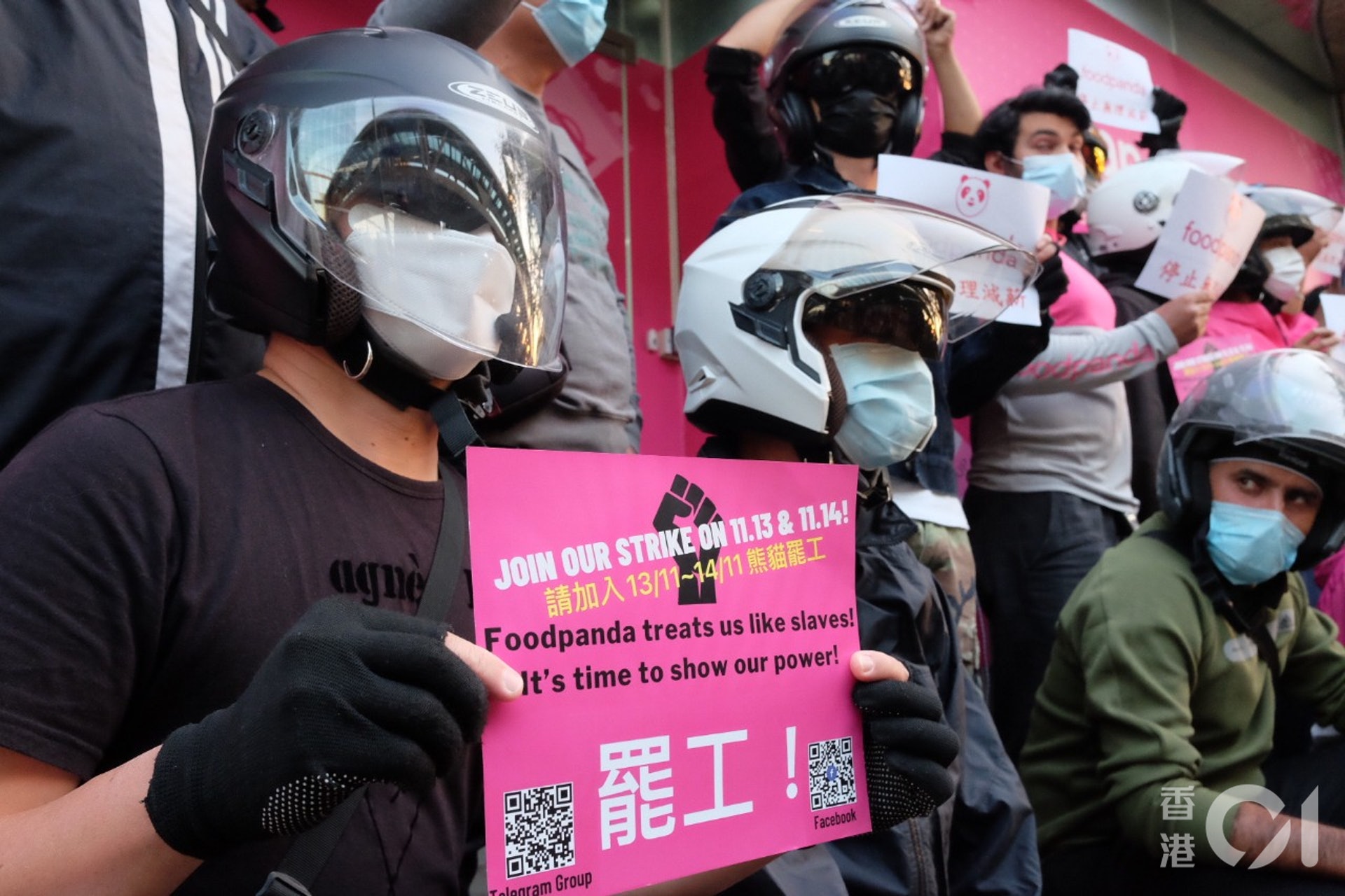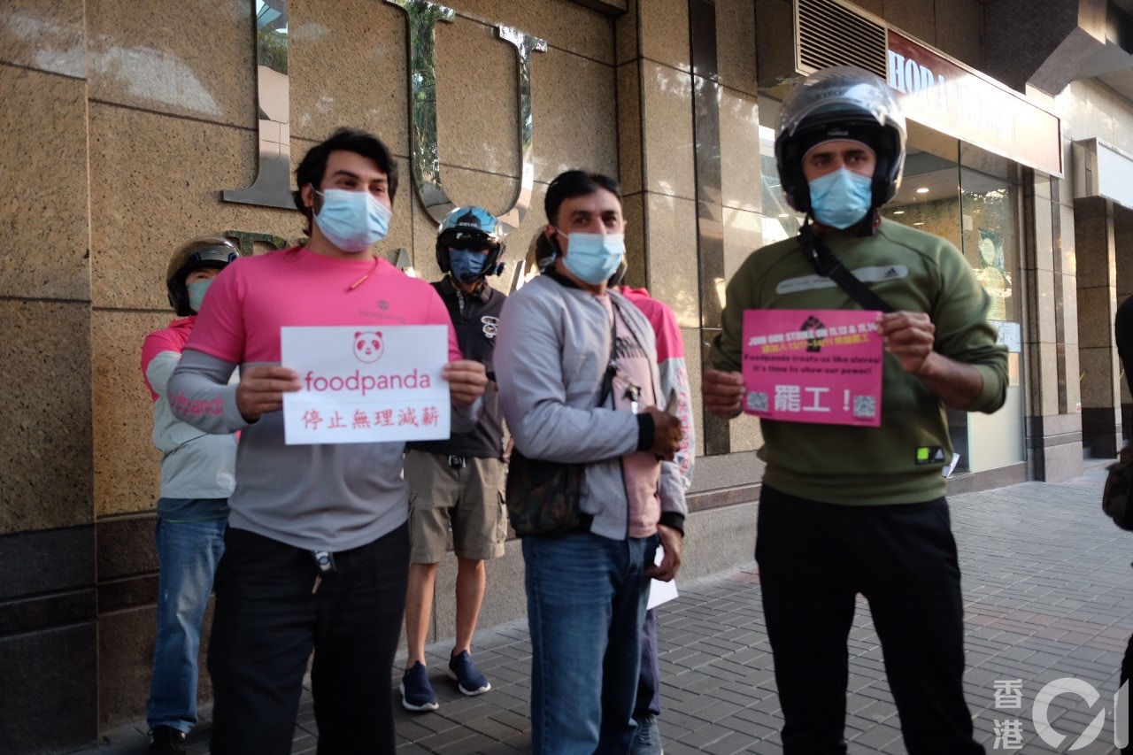 Foodpanda送遞員抵觀塘門市抗議。(莫家文攝)