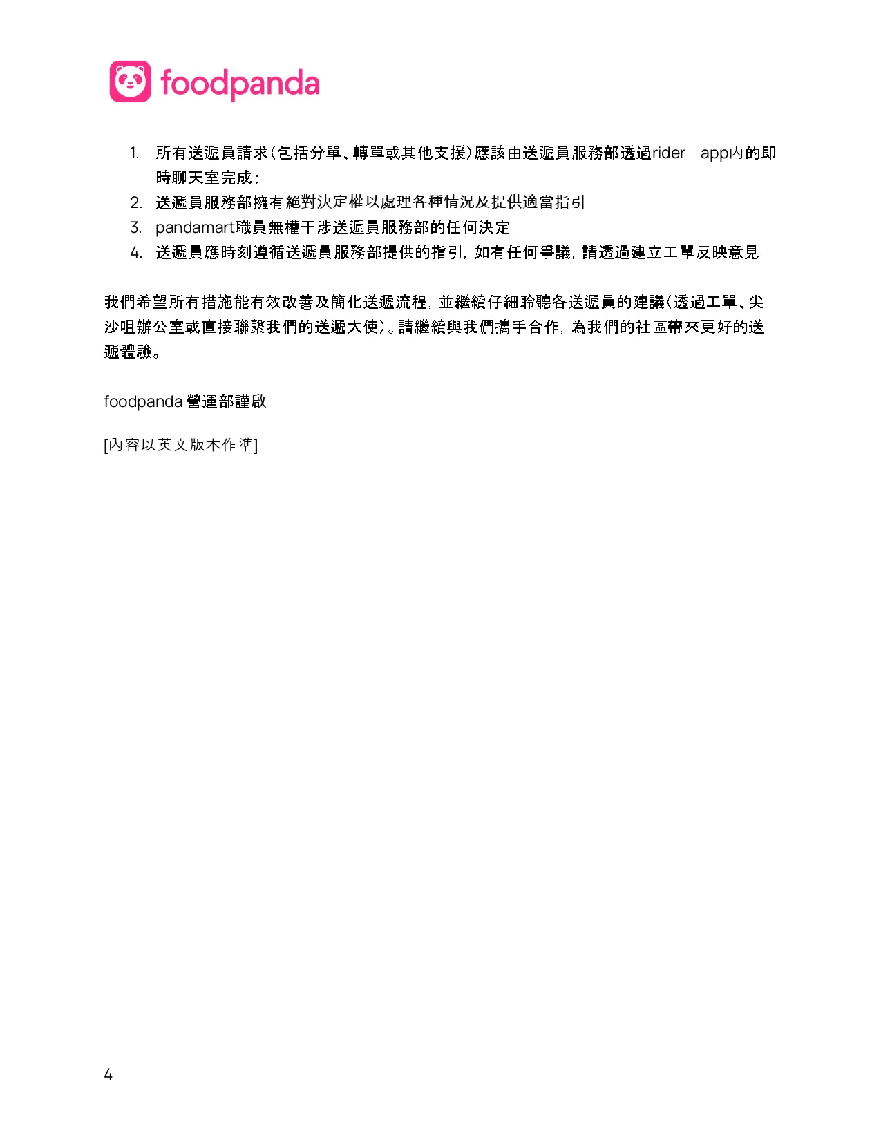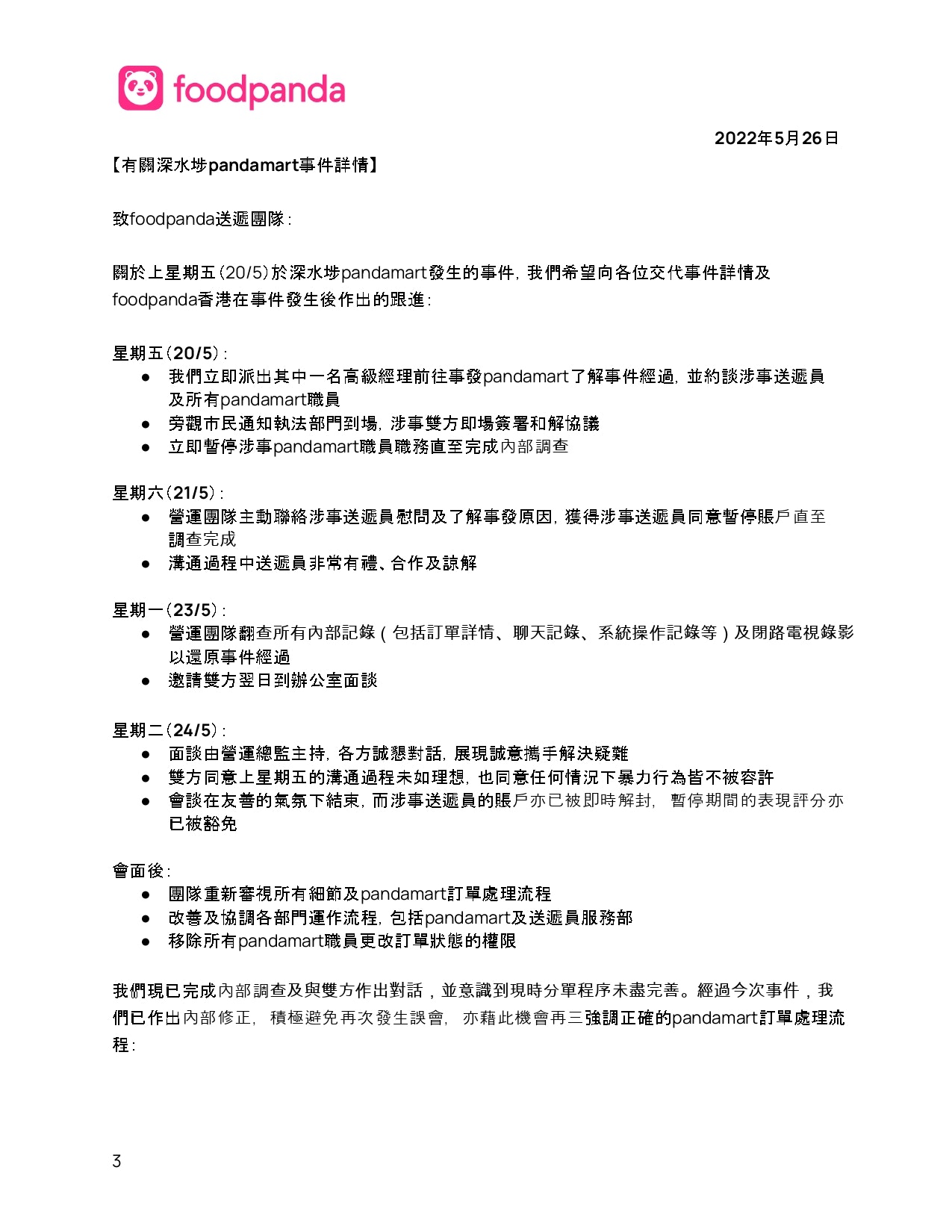 Foodpanda香港方面回應,確認上周五(20日)於深水埗Pandamart發生的爭執,並已主動約見涉事外賣員及員工「面對面傾清楚」。公司表示會持續改善流程,重申任何人都不應以暴力解決分歧,呼籲員工與送遞員透過官方渠道反映意見,以便制定具體、可行的方案,避免同類事件重演。