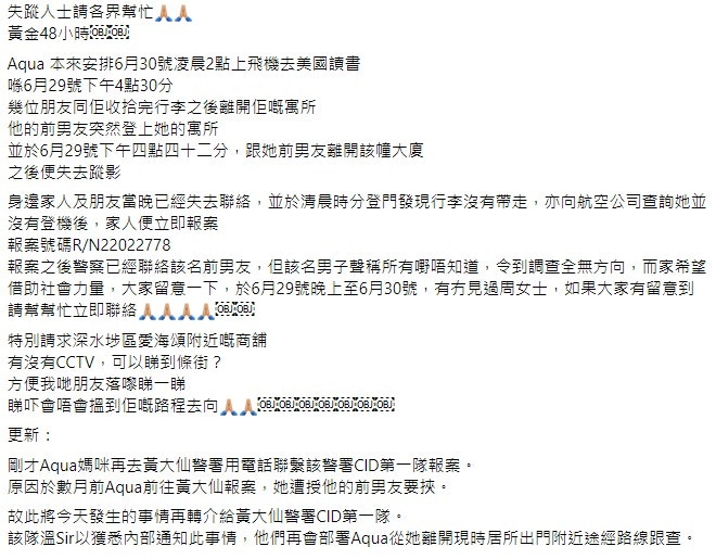 親友隨即在社交平台上發布尋人啟事,指友人於6月29日下午約4時半離開周女住所,數分鐘後其前男友便現身上門,並與她一同離開。