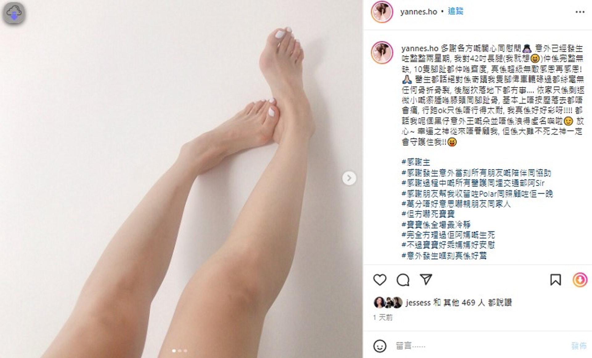 事隔兩星期後,Yannes昨日(23日)再於Instagram更新近況,自嘲自己是「黑仔意外王」,笑言目前只是膝頭與腳趾微腫、走路有點不便,但「10隻腳趾都仲喺度,真係感恩到爆!」醫生亦對她的康復狀況大感驚訝:「佢話我俾車轆碌過都無斷骨,後腦著地都冇事,簡直係奇蹟。」