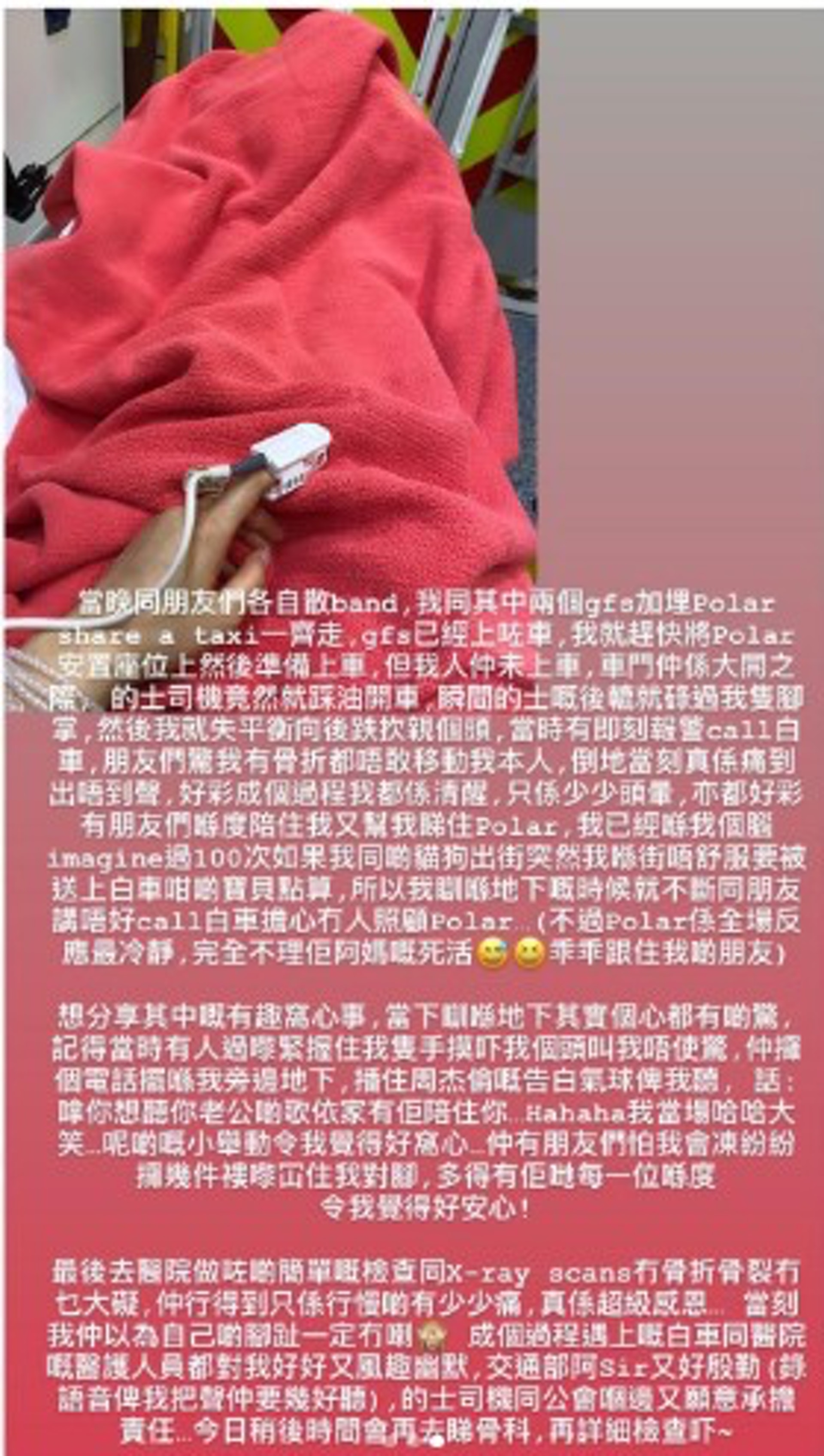 她同時分享了事發當晚的片段,影片中可見她倒在馬路中央,由救護員協助抬上擔架;她其後曬出雙腿照,幾乎看不出任何傷痕,情況令人難以置信。多位圈中好友,包括謝安琪及姚子羚,也紛紛留言為她打氣:「Get well soon!」