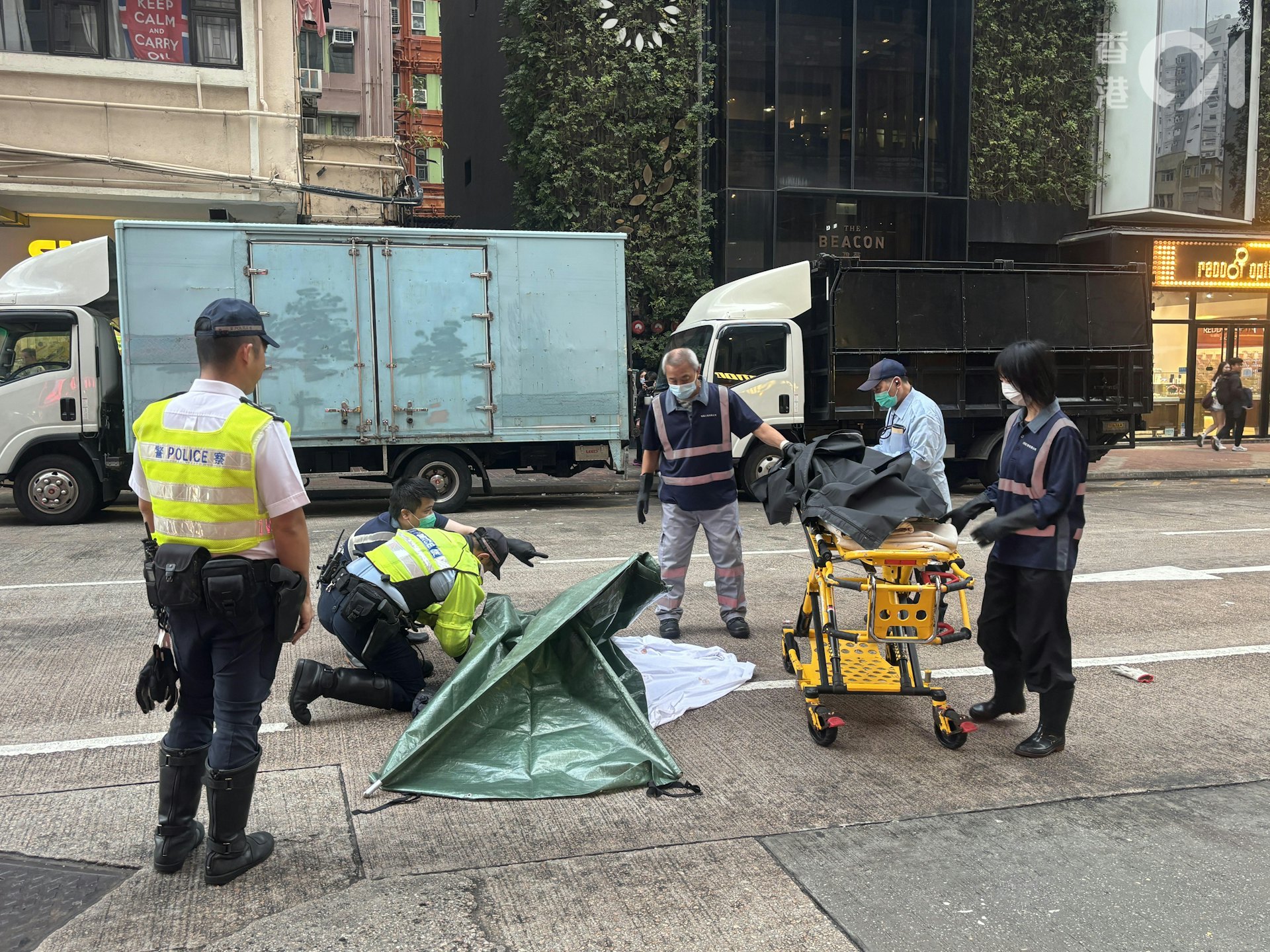 一名女子於旺角洗衣街與亞皆老街交界遭旅遊巴撞倒身亡,警方其後以白布覆蓋遺體。