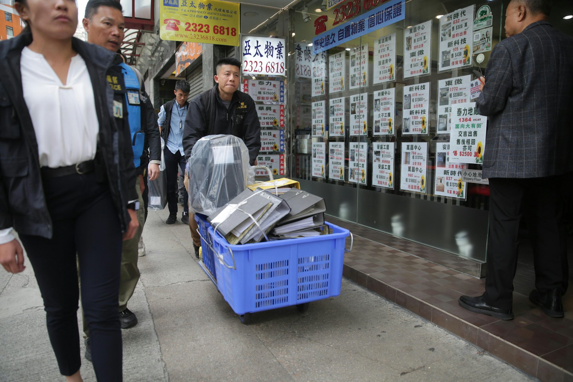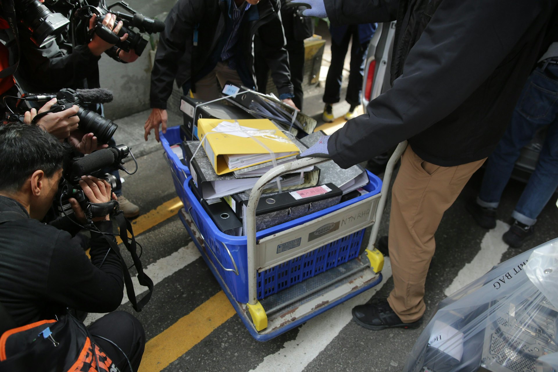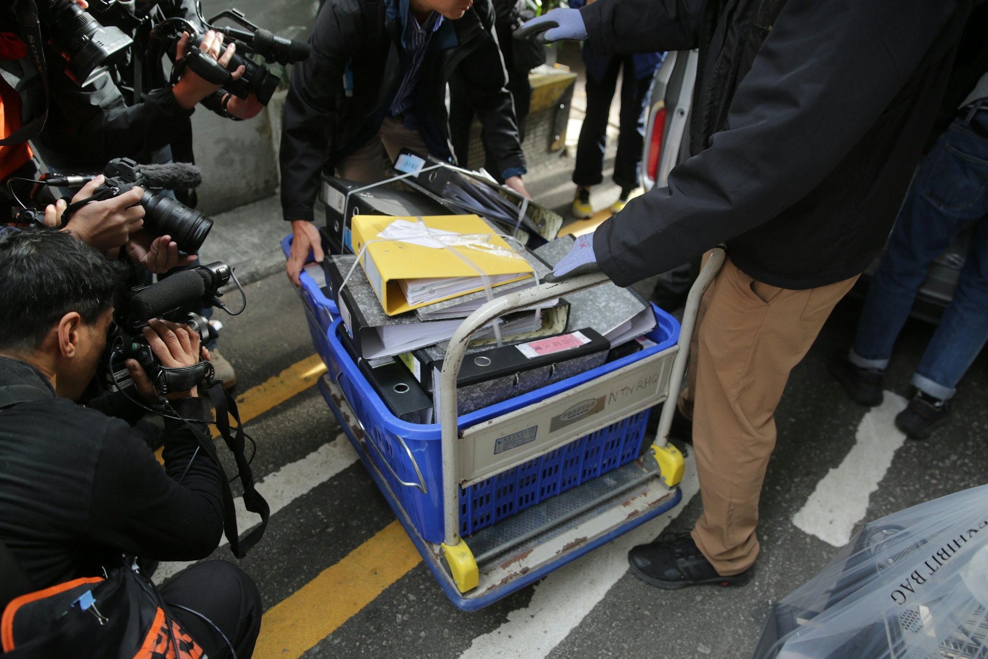 一箱箱的文件被檢取調查。(黃偉民攝)