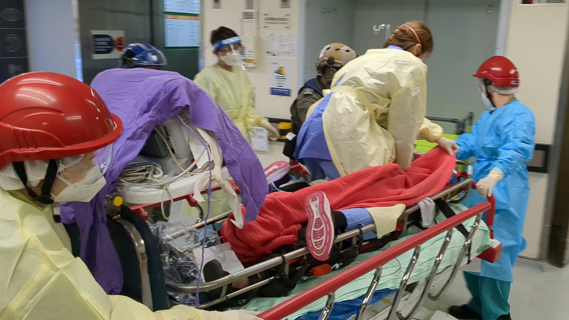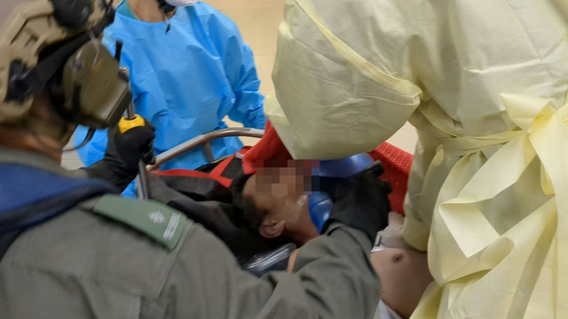 事主昏迷由直升機送到東區醫院搶救,其間救援人員替他做心外壓急救。(黃偉民攝)