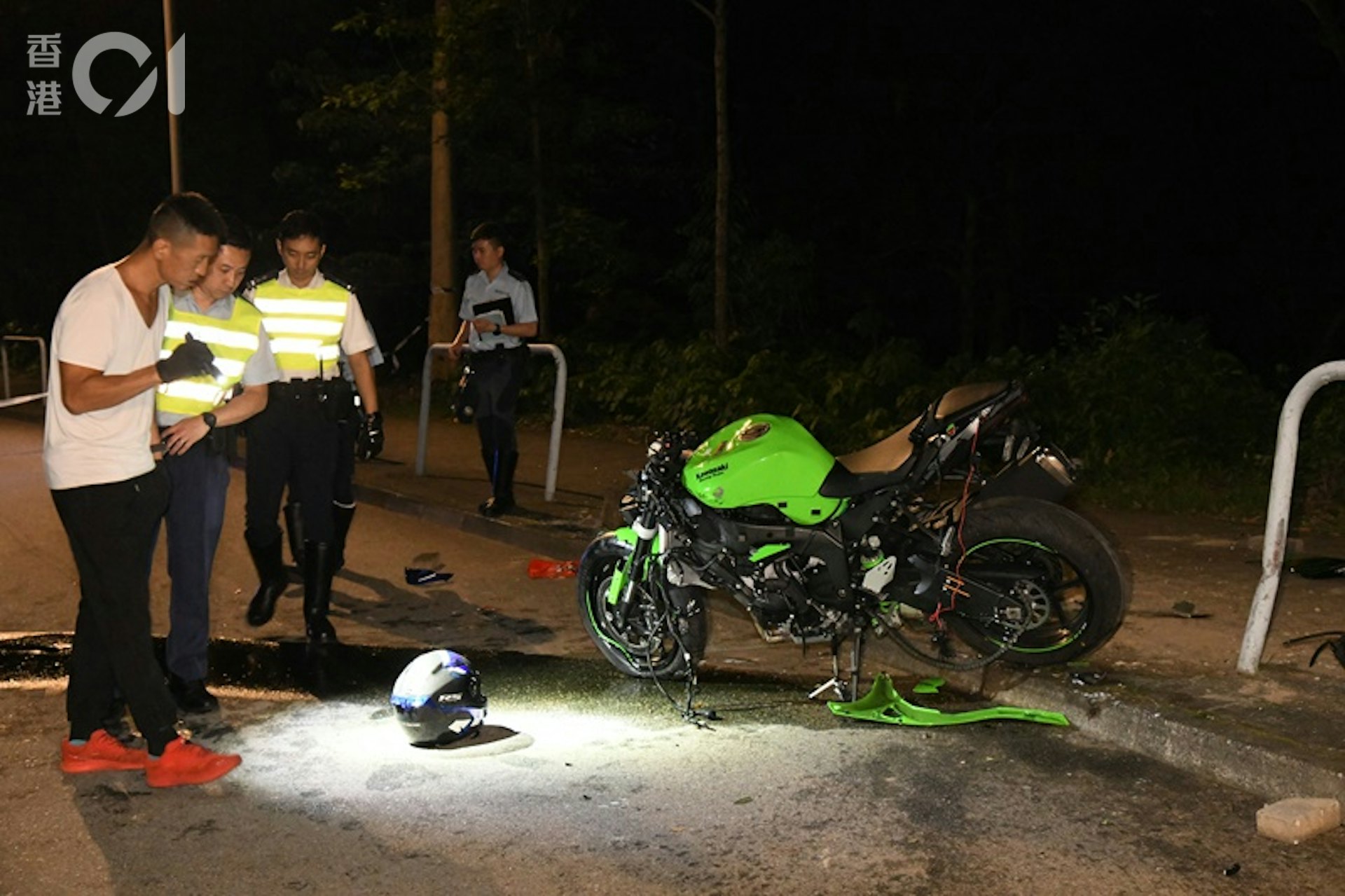 電單車猛撞路旁鐵欄,衝力之大令整段欄杆被硬生生拔起。意外造成司機喪生、乘客受傷。地面遺下疑屬兩人的個人物品,包括頭盔等。警方其後封鎖現場展開調查。