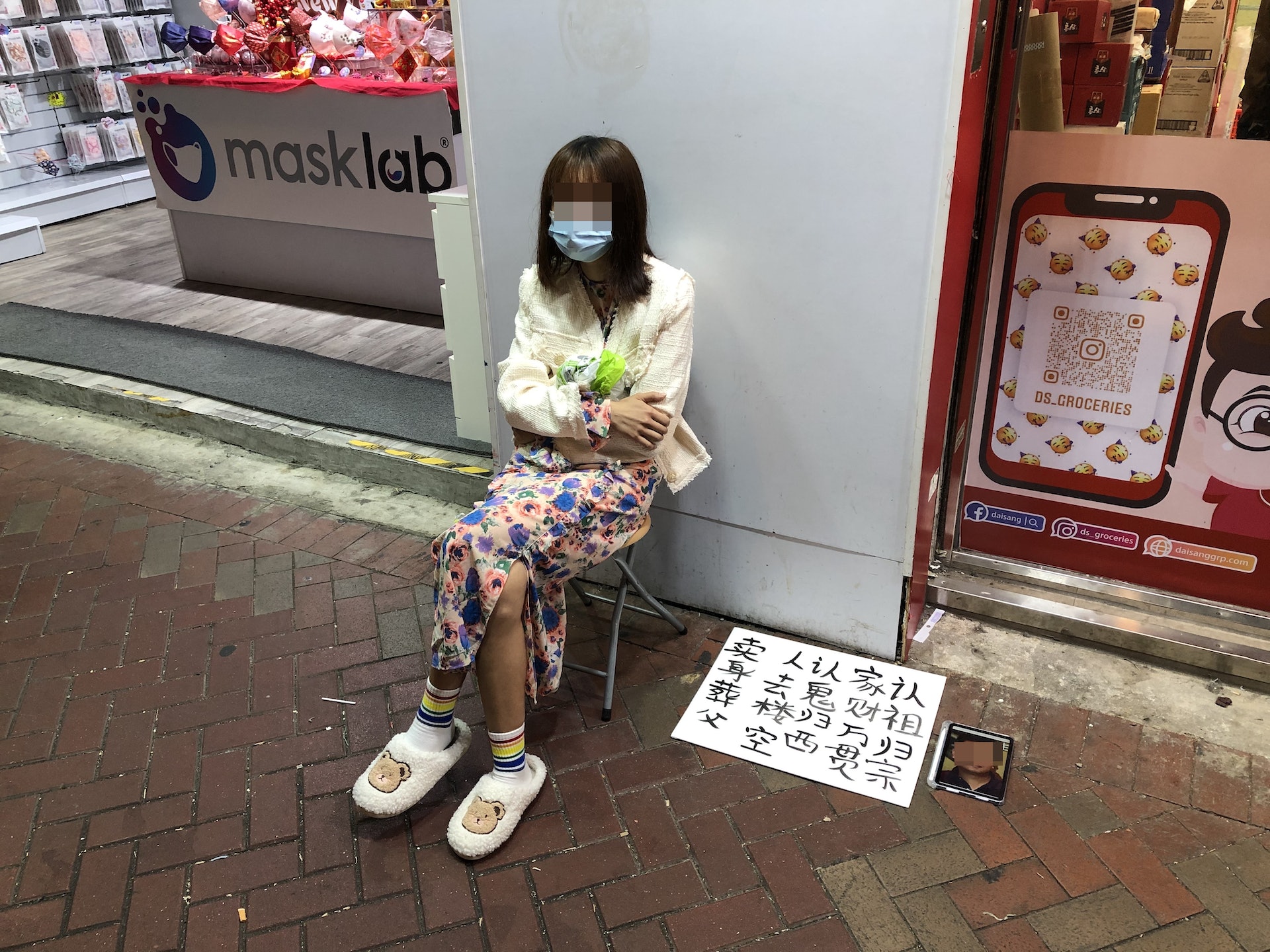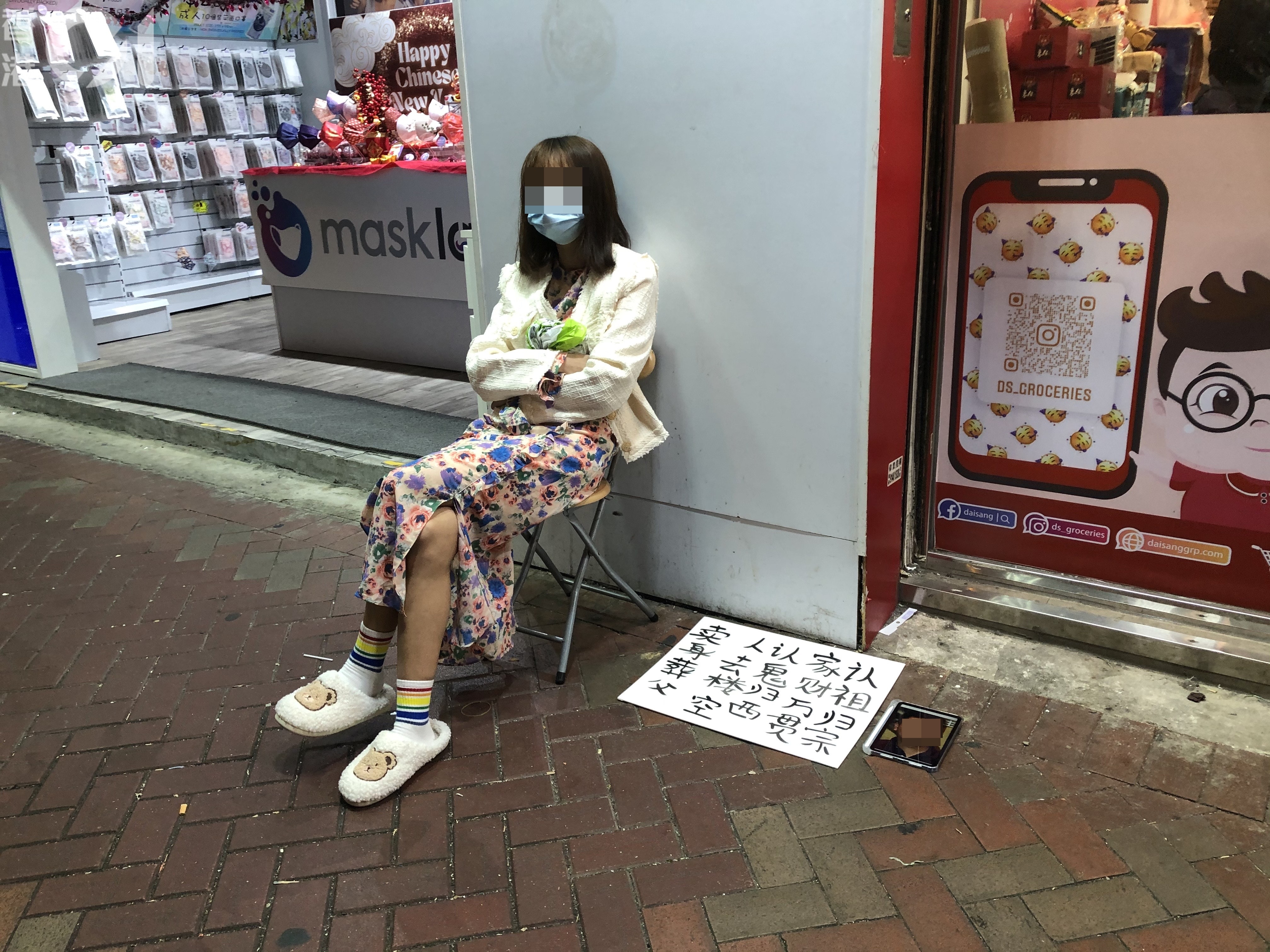 旺角街頭驚現奇女子「賣身葬父」,向途人索價30萬元,成為網上熱話。(陳浩然攝)